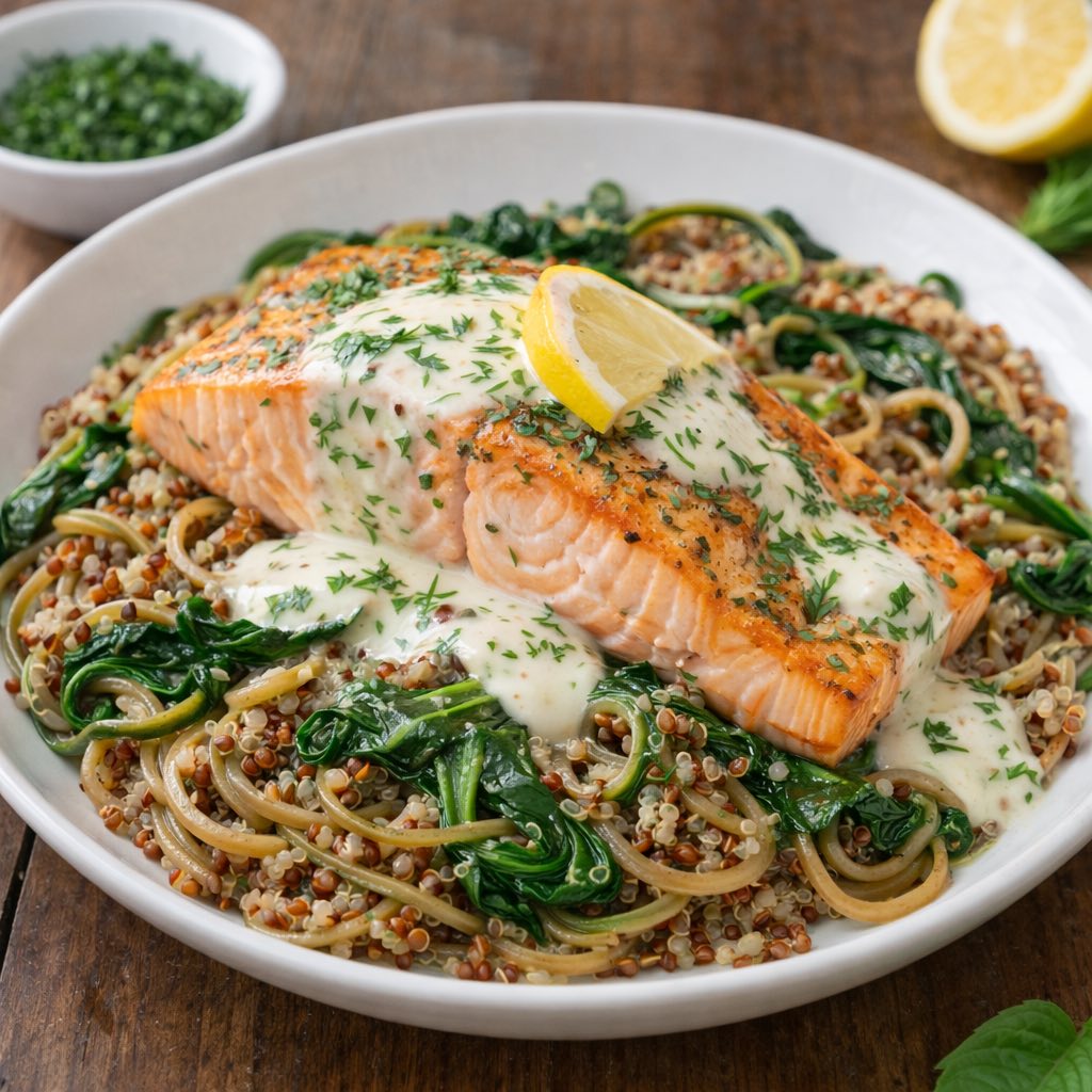 Salmon Quinoa Noodles is a light yet hearty dish that combines delicate, flaky salmon with quinoa noodles, creating a nutritious, gluten-free alternative to traditional pasta. Tossed with a fresh, zesty sauce and vegetables, it offers a perfect balance of protein, healthy fats, and fiber for a delicious and wholesome meal.